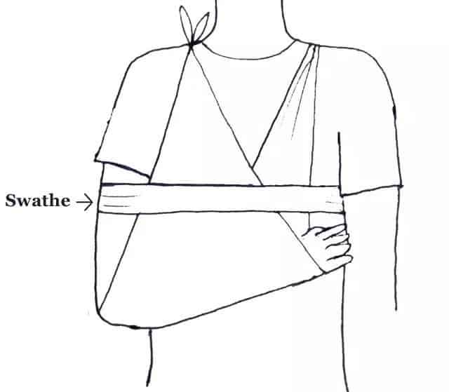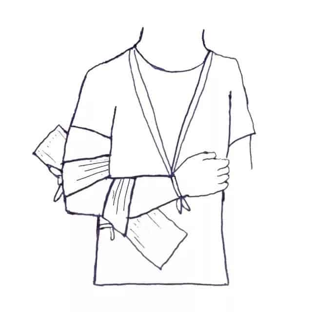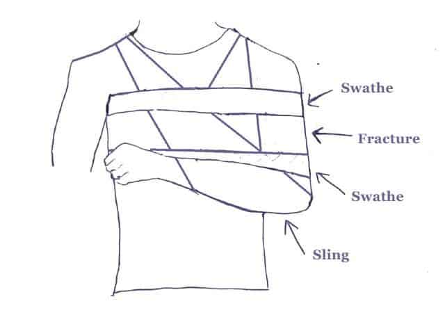 La meilleure façon de le faire est d’utiliser une élingue et une bande. Avec cette méthode, vous pouvez réellement sauter l’attelle ; le corps de la victime est utilisé comme objet rigide pour maintenir la fracture en place.