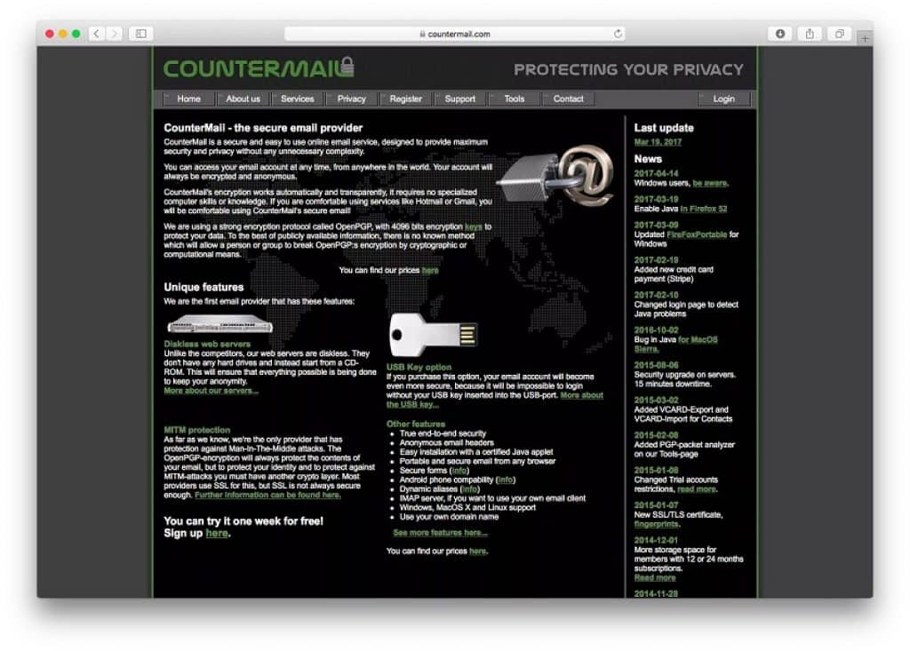 CounterMail utilise également un cryptage de bout en bout et est l’un des seuls fournisseurs de messagerie connus à proposer sa propre option de clé USB sécurisée, ce qui en fait un excellent choix pour les personnes qui envoient constamment des messages sécurisés en déplacement.