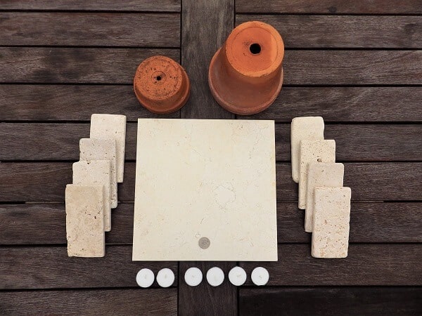 - Construisez les petits carreaux sur le grand carreau de manière à pouvoir supporter les deux pots de fleurs et à créer un espace-air suffisant pour que les bougies restent allumées sous un pot inversé.