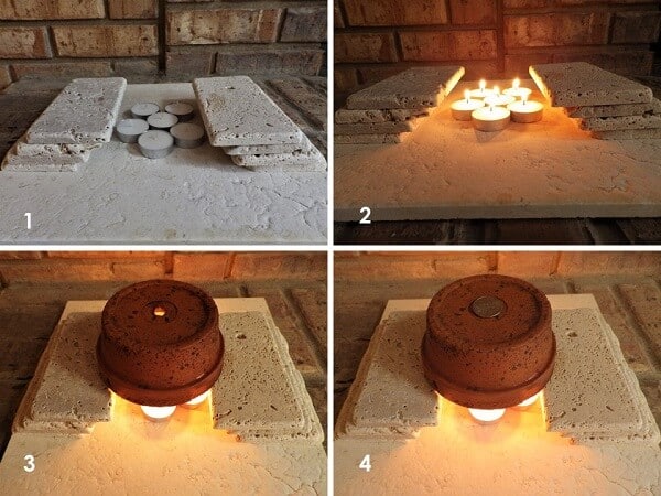 Il semble absurde de penser qu’une seule bougie chauffe-plat pourrait produire suffisamment de chaleur pour chauffer une pièce, et vous avez raison. Il faut 4 à 6 bougies à thé pour faire le travail. Ce qui fait que ce chauffe-bougie fonctionne est le concept d’échange de chaleur. Les pots de fleurs en terre cuite remplissent le rôle d’échangeur de chaleur et, au bout de 20 à 30 minutes, ils deviennent très chauds à cause des petites flammes de quelques bougies.