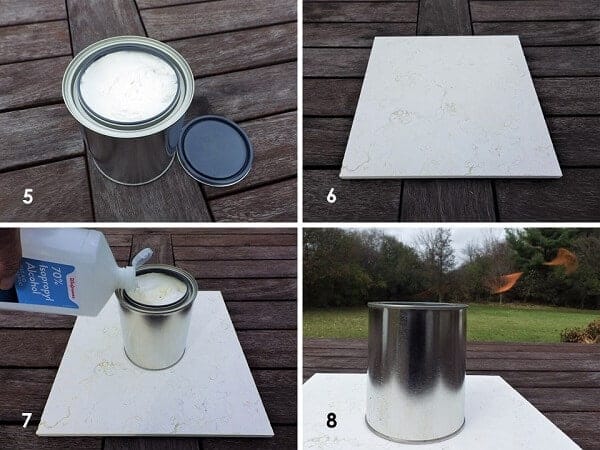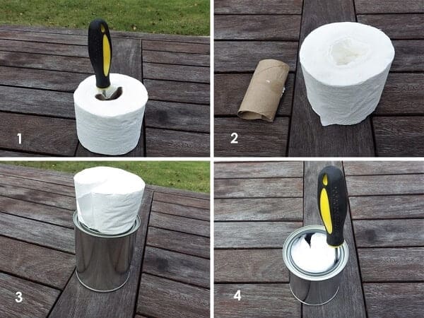 Une option est une boîte de conserve en métal ou une autre boîte de conserve. La boîte doit être bien rincée et l’étiquette en papier ainsi que la ligne de colle doivent également être enlevées. À partir de là, le principe est le même que celui de la peinture, sauf que vous n’aurez pas de couvercle hermétique pour l’extinction, le stockage et l’utilisation future.