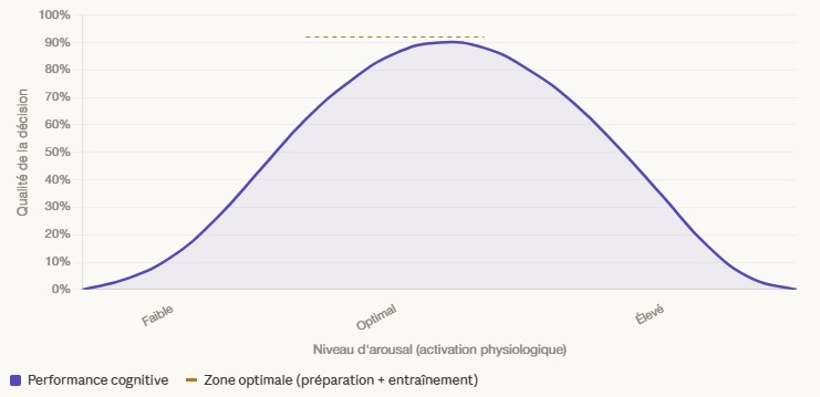 - La zone optimale de performance (Yerkes-Dodson) est étroite — trop peu ou trop de stress dégrade la décision