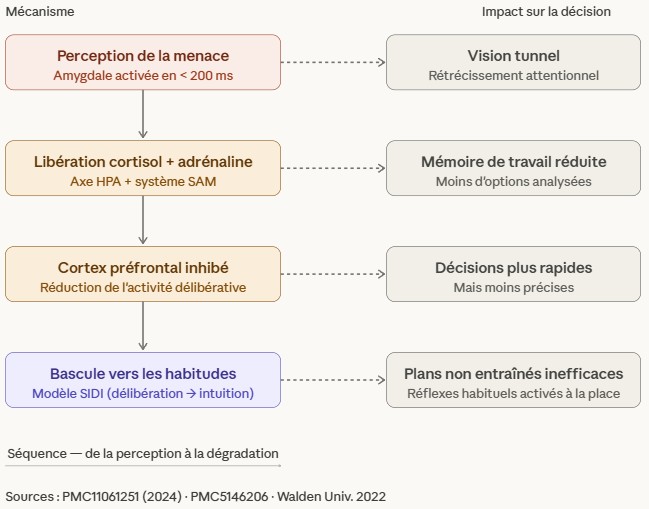 - Le stress réduit l’activité du cortex préfrontal — la délibération analytique est la première capacité dégradée
