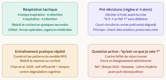 Une revue intégrative publiée dans Comprehensive Psychoneuroendocrinology en 2024 (PMC11061251) identifie les variables qui modulent l’impact du stress sur la décision : la proximité temporelle entre le stresseur et la décision, la nature du stresseur, le profil psychobiologique individuel et l’état émotionnel au moment de décider. Ces facteurs expliquent pourquoi deux personnes soumises au même stresseur ne décident pas de la même façon — et pourquoi l’entraînement change radicalement l’équation.