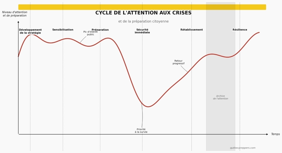 Ce phénomène n’a rien d’anecdotique. Il est documenté, prévisible, et il a un nom dans la littérature sur la communication de crise : le cycle de l’attention. Comprendre pourquoi ce cycle existe — et pourquoi il est si difficile d’en sortir — est probablement plus utile que n’importe quelle checklist de préparation.
