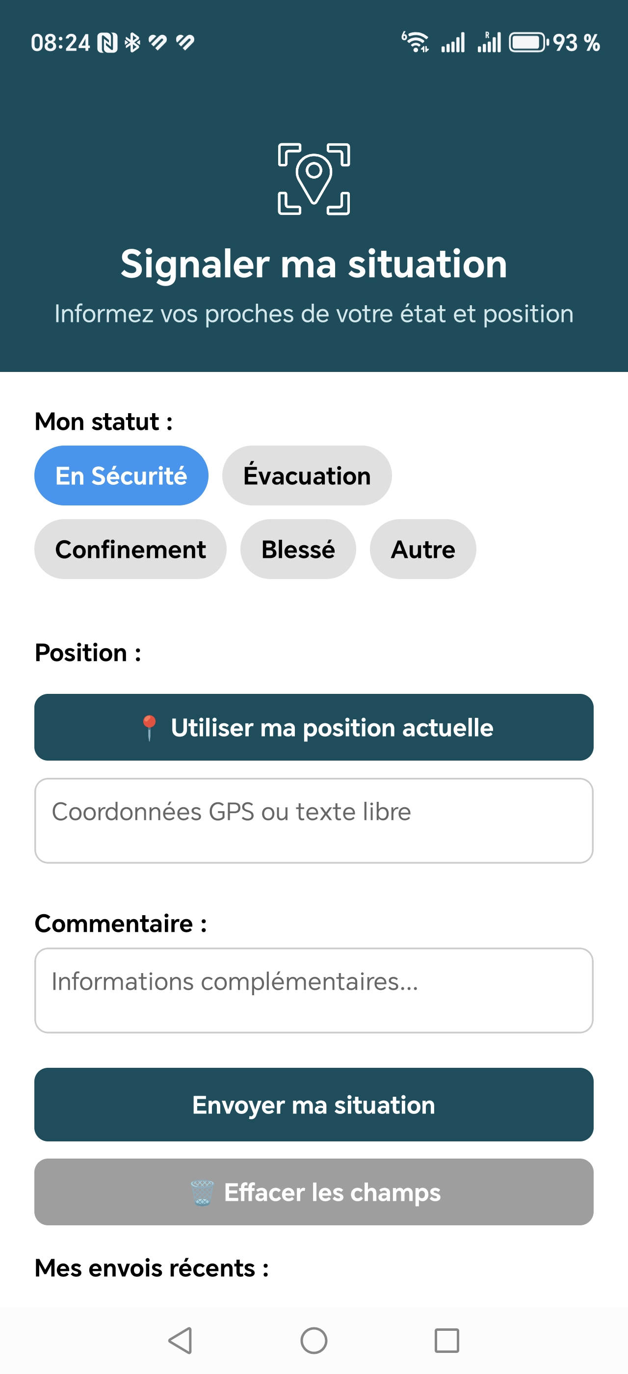 Ajoutez à cela la fonction “Signaler ma situation”, qui permet en un clic de transmettre votre état, votre position et un commentaire à vos proches.