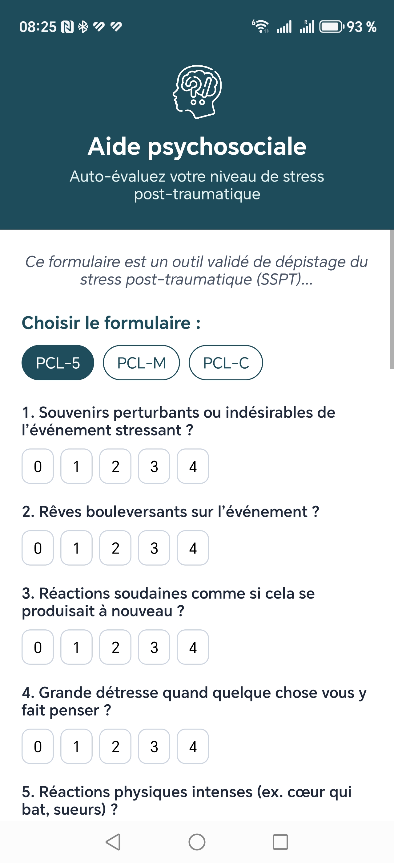 C’est pourquoi PrépaCivile intègre aussi un accompagnement psychosocial à travers des sections dédiées à la gestion du stress, aux ressources d’aide disponibles dans votre région, et aux contacts d’urgence pour soutien psychologique.