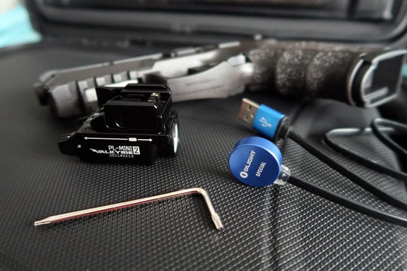 La PL-MINI 2 Valkyrie utilise une batterie lithium-ion rechargeable par USB et est livrée avec tout le matériel (et même un outil) pour assurer son montage sur votre pistolet (tant que votre pistolet est suffisamment gros.