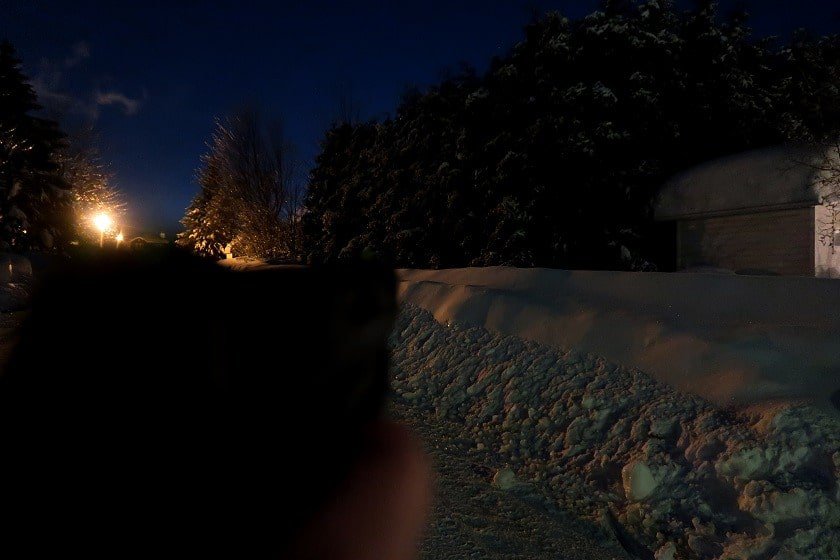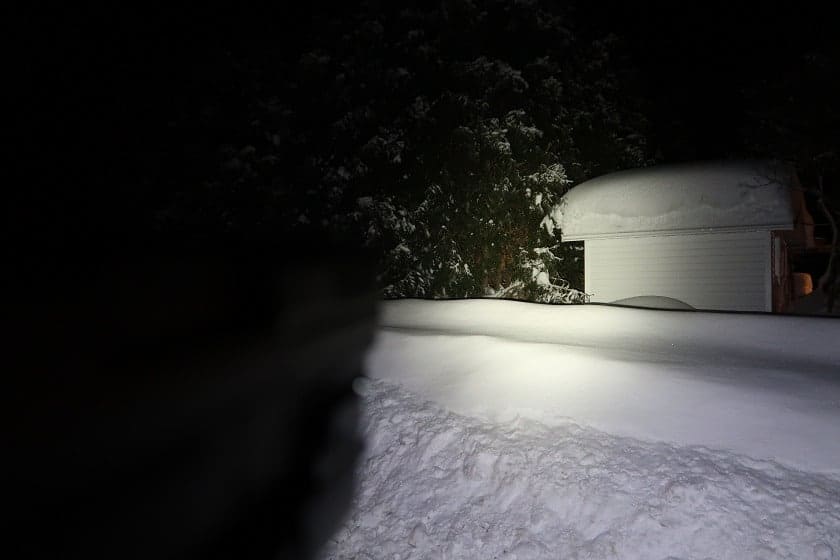 Six cents lumens, c’est beaucoup de luminosité. La photo ci-dessus représente 50 pieds de distance, ce qui suffit amplement pour éclairer n’importe qui à bonne distance de votre maison dans une situation de défense à la maison. Et si vous devez la sortir durant des intempéries, la Valkyrie Mini 2 est conforme à la norme IPX6 en matière de résistance à l’eau. Cela signifie qu’elle va résister à un orage très dur et continuer de fonctionner parfaitement. Ne la plongez pas totalement dans l’eau, d’accord?